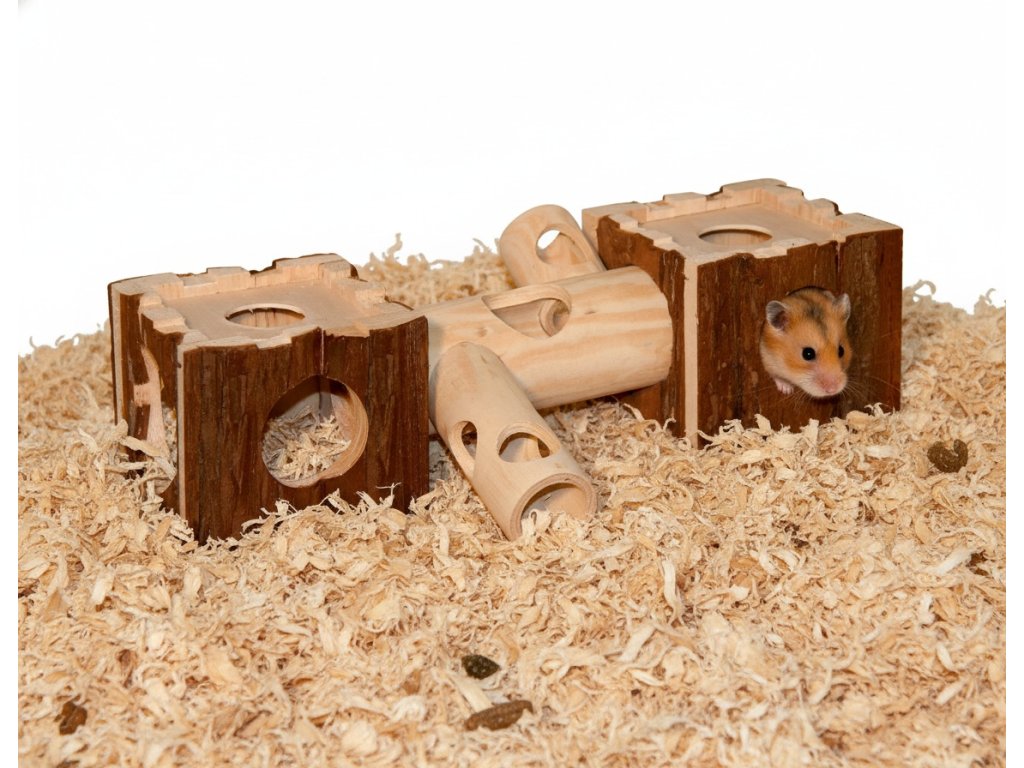 Dřevěná prolézačka s tunely pro křečka nebo myš. Členitá prolézačka z bezbečného přírodního materiálu, která vašeho hlodavce jistě zabaví.