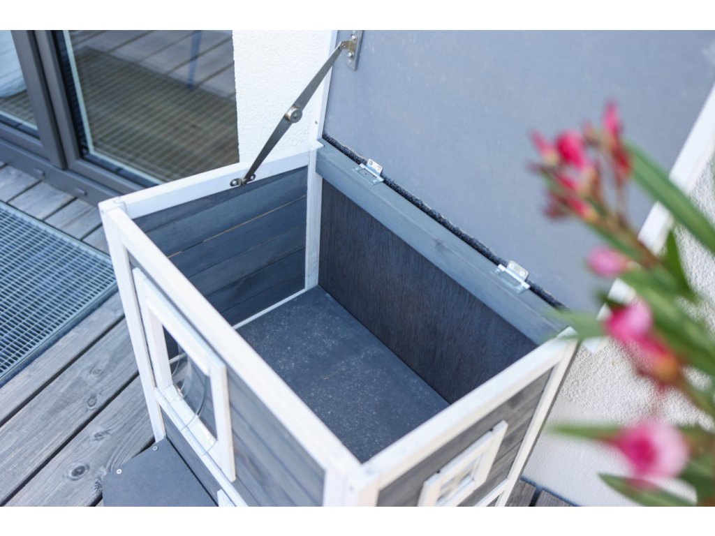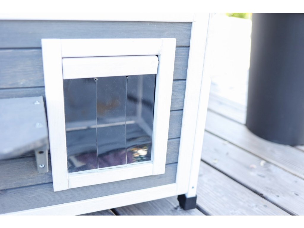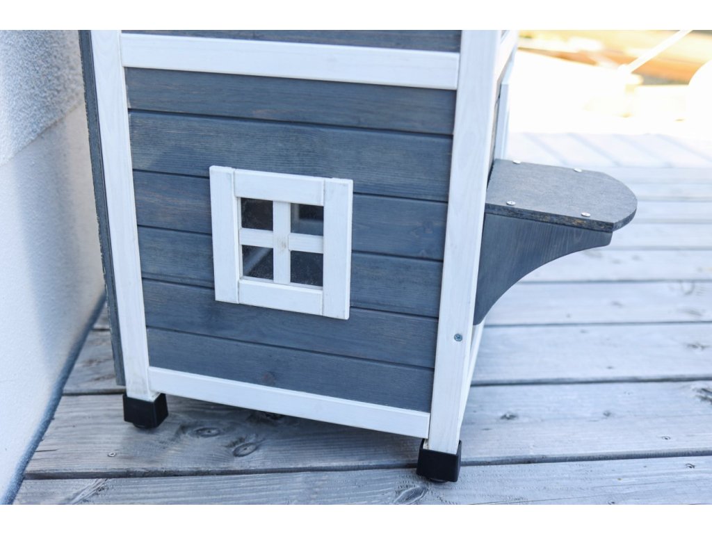 Domek pro kočky je ošetřen základním nátěrem. Pro delší životnost je třeba, jako u každého dřeva, ochranný nátěr obnovovat. Dále pak umístěte domek ideálně tak, aby byla chráněn před deštěm, sněhem a extrémním slunečním zářením.