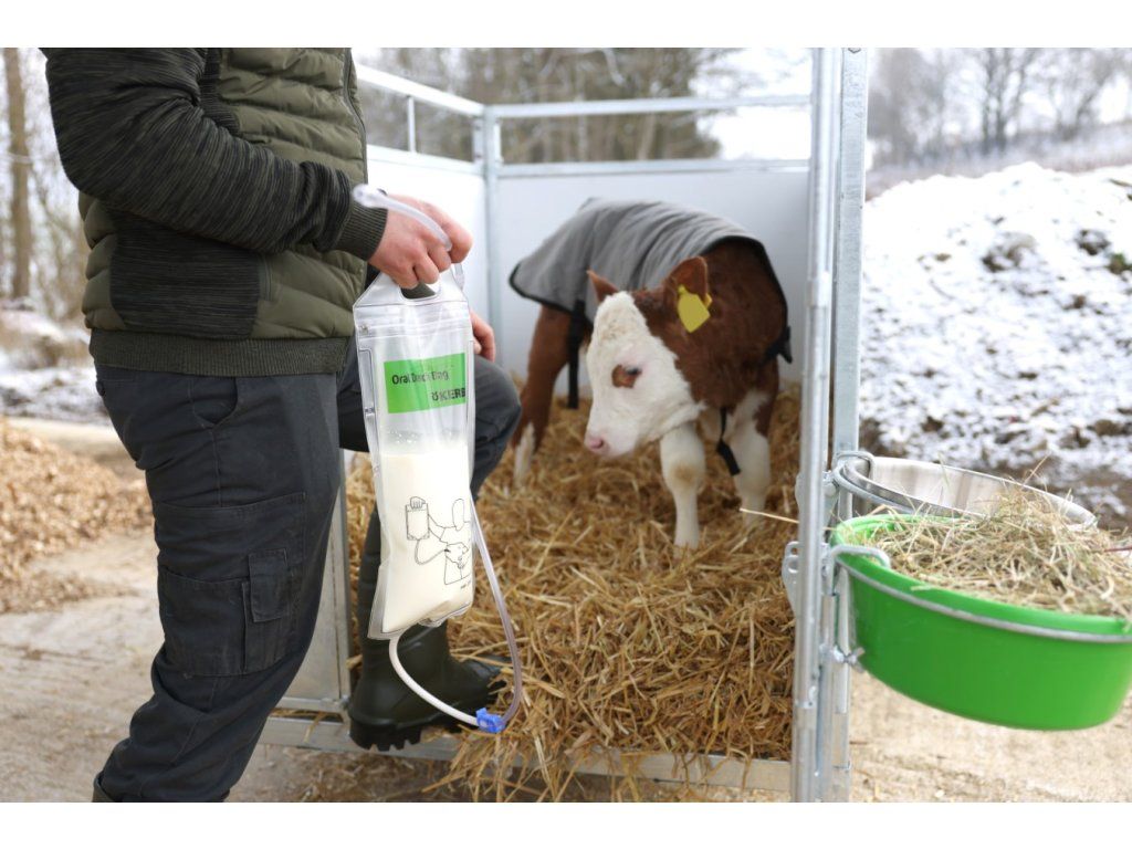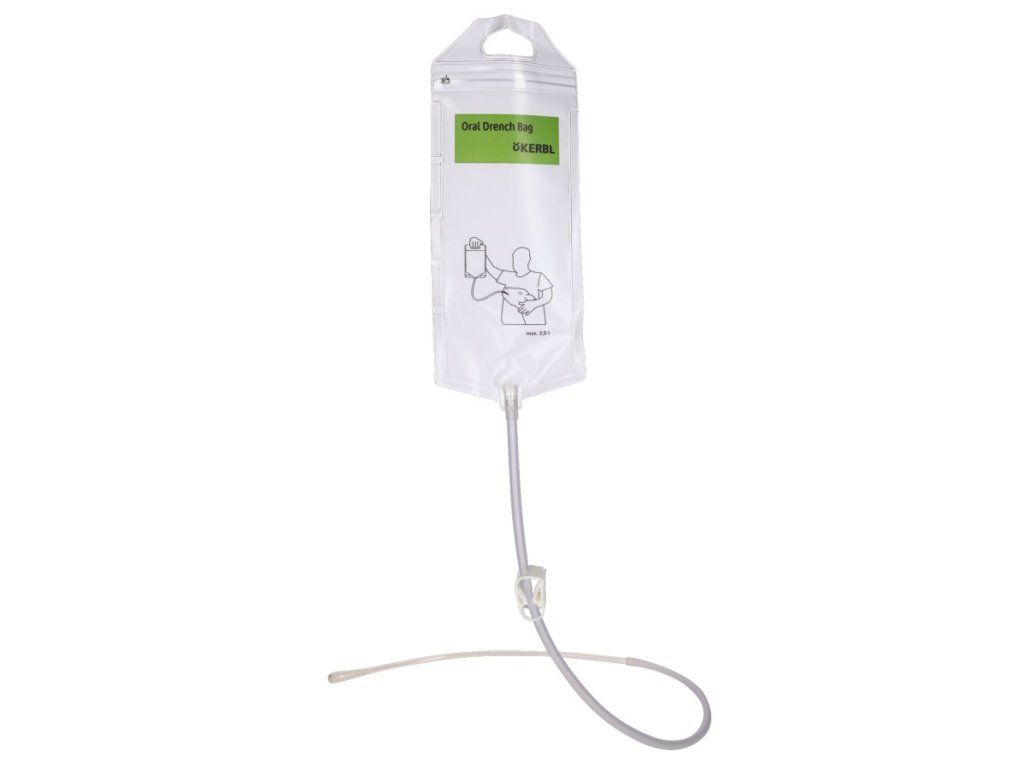 Průhledný plastový krmný vak pro telata s flexibilní sondou. Drencher umožňuje pohodlné, efektivní a rychlé doplnění živin, elekrolytů a doplňků stravy telatům.