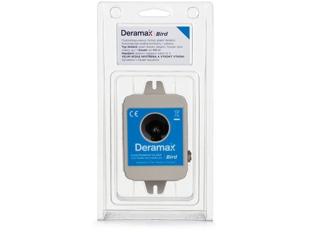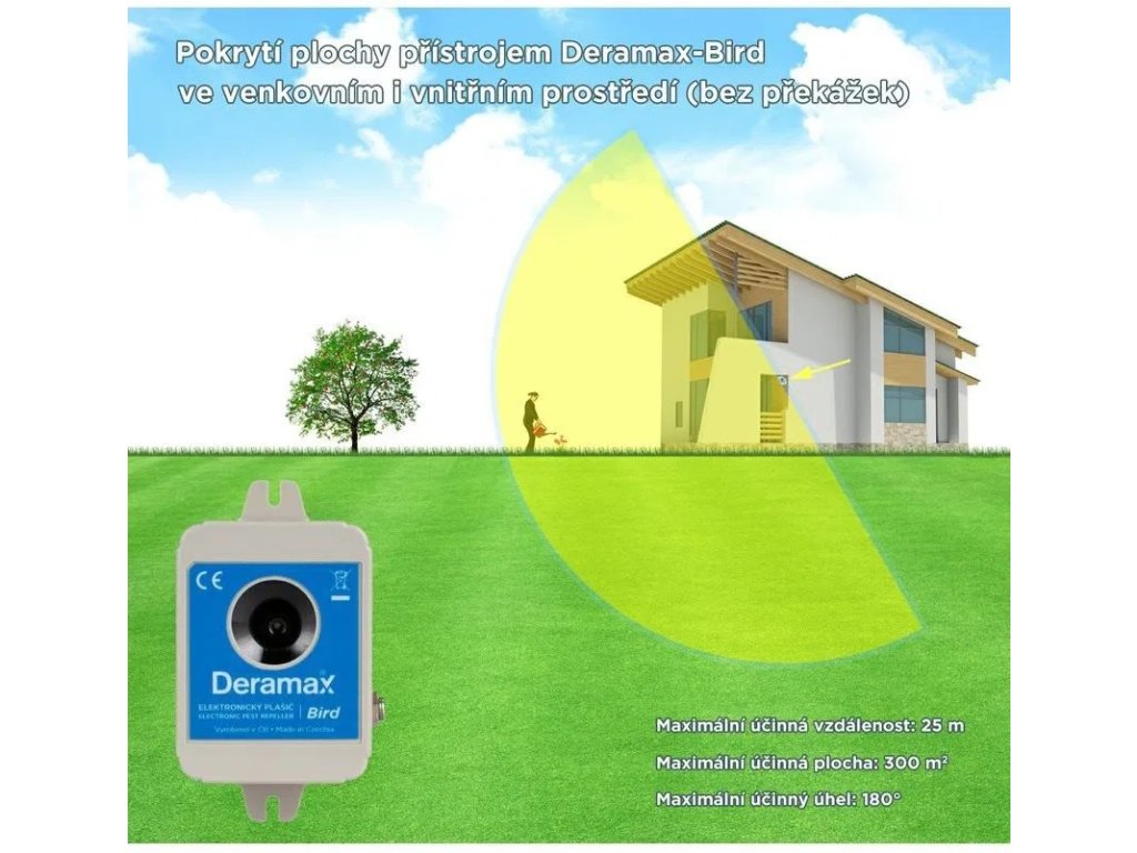 Ultrazvukový plašič ptáků je profesionální zařízení generující specifické signály o aktustickém tlaku 95dB, zcela neslyšitelné pro člověka, avšak mimořádně nepříjemné pro ptáky. Klíčem k dlouhodobé účinnosti je automatická změna kmitočtu a výkonu, která zabraňuje adaptaci ptáků na signál – na rozdíl od běžných plašičů si tak na Deramax BIRD ptáci nezvyknou. Zařízení je vyrobeno v České republice a jeho parametry byly nezávisle ověřeny renomovanými zkušebnami.