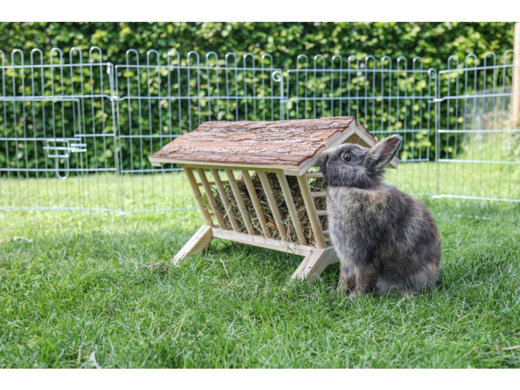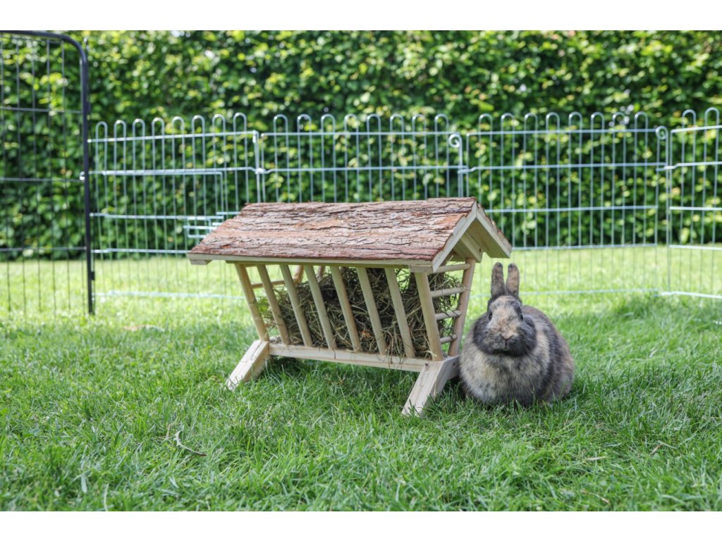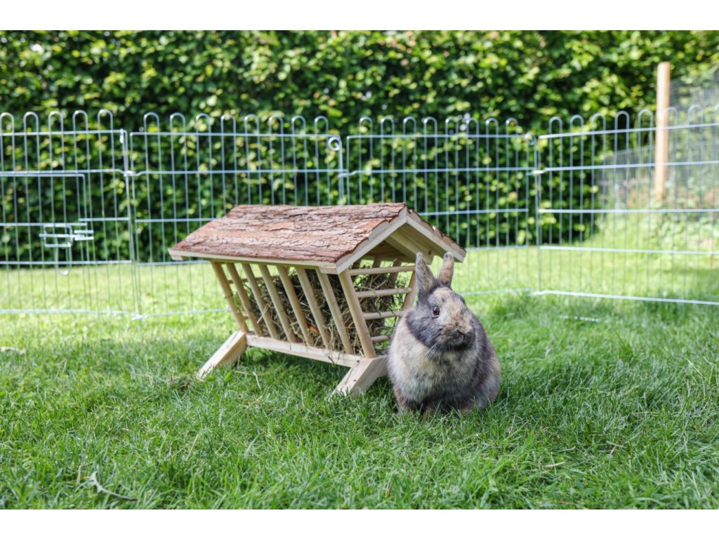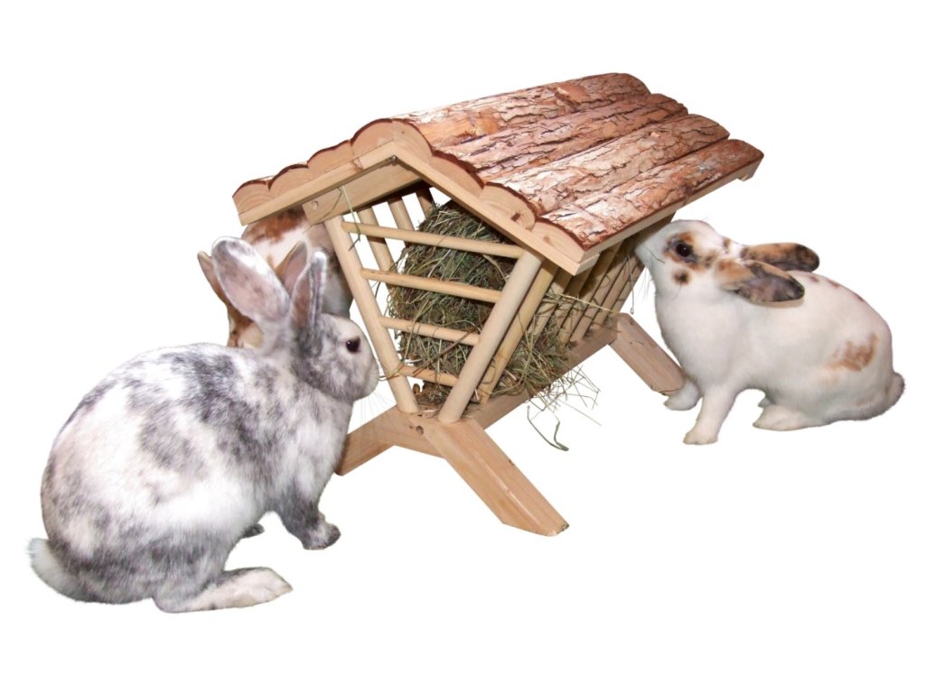 Jesle na seno ve tvaru krmelce. Stabilní dřevěné jesličky pro králíčky a morčátka z přírodního neošetřeného dřeva. Pro umístění v prostoru pro přístup ze všech stran. S odnímatelnou střechou pro snadné doplnění sena shora