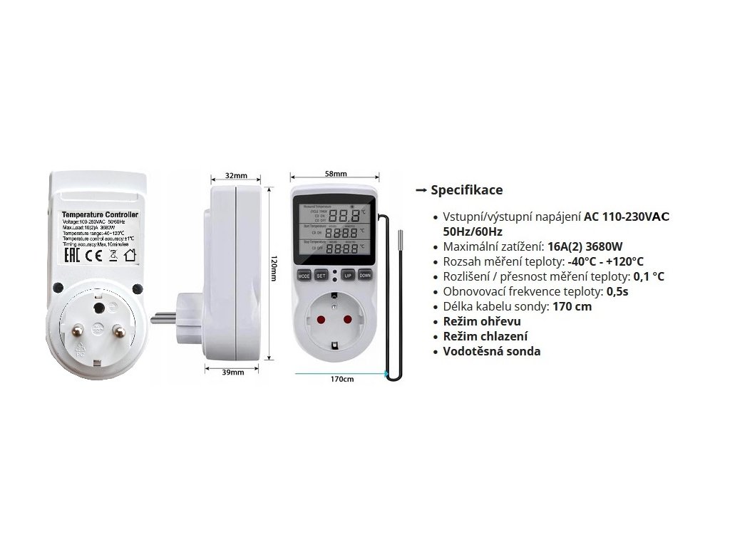 Regulátor teploty zásuvkový s externím čidlem. Termostat s čidlem je vhodný k výhřevným deskám, miskám a lampám. Použitím regulátoru lze ušetřit za energii a čas.
